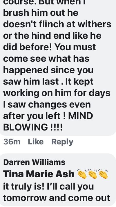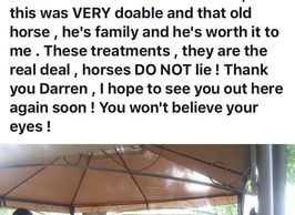 Blaze continued to improve for days after his three therapy sessions and his owners reported a tremendous positive change in his body movement and Attitude. Horses don’t lie they don’t know that this is Supposed to help them which Nullifies any argument of “placebo effect “. The living cell responds positivity and positive results occur!